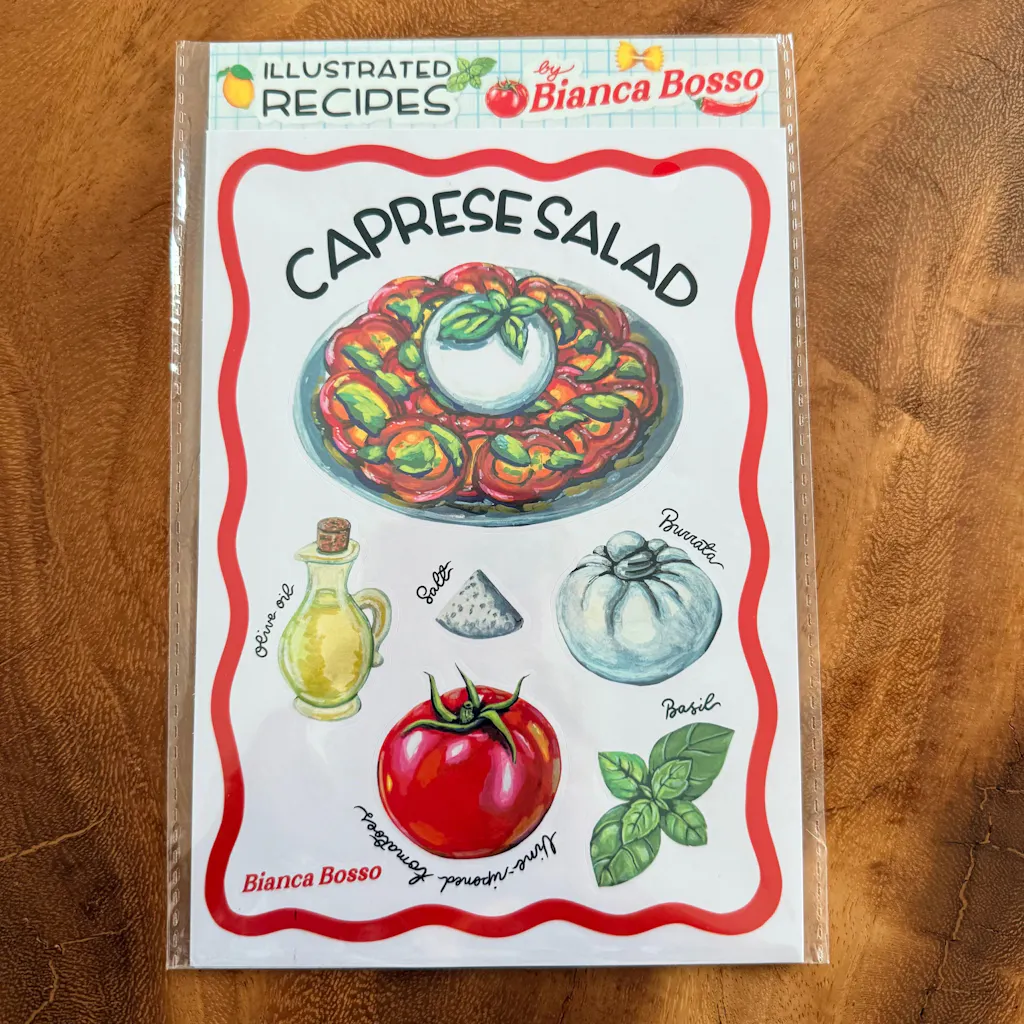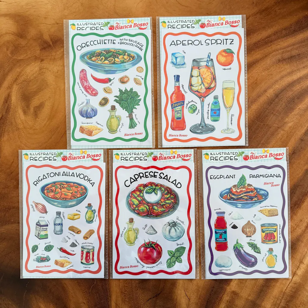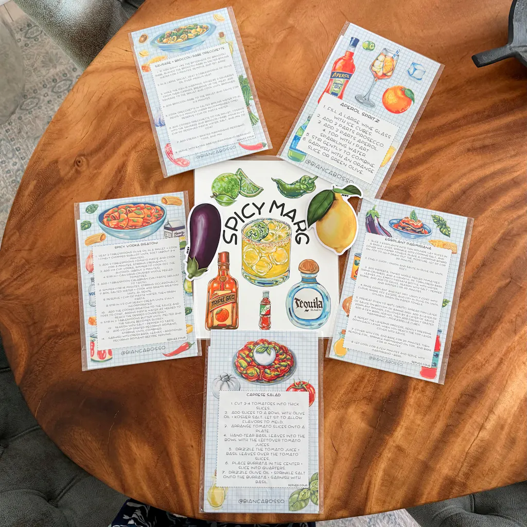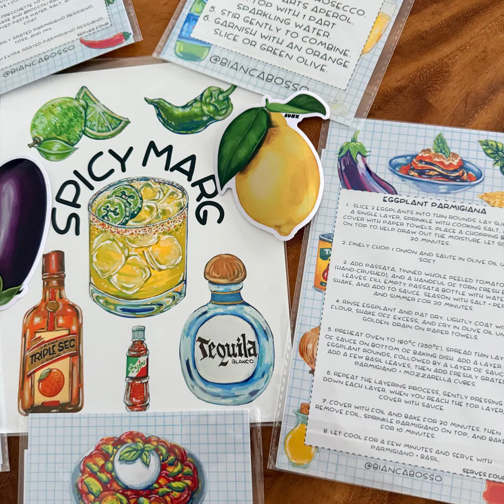 Each A5 sheet features Bianca’s ingredient illustrations, perfect for decorating cookbooks, recipe journals, planners, or crafts. Plus, every sheet includes a bonus cut-out recipe card on the back to inspire your next meal or cocktail hour!
